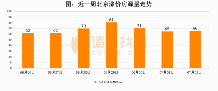 根据诸葛找房数据显示,北京24小时涨价房源量为66套,较07月01日增加1套,环比上涨1.5%。与此同时,涨价房源占比小幅扩大,业主信心有所提升。
