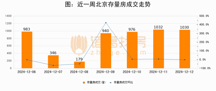 从存量房来看,2024年12月12日北京存量房单日成交1030套,比昨日减少2套,环比下降0.2%。从近一周存量房成交来看,北京存量房日均成交套数为783套,12月12日单日成交1030套,高于近一周平均水平31.5%。