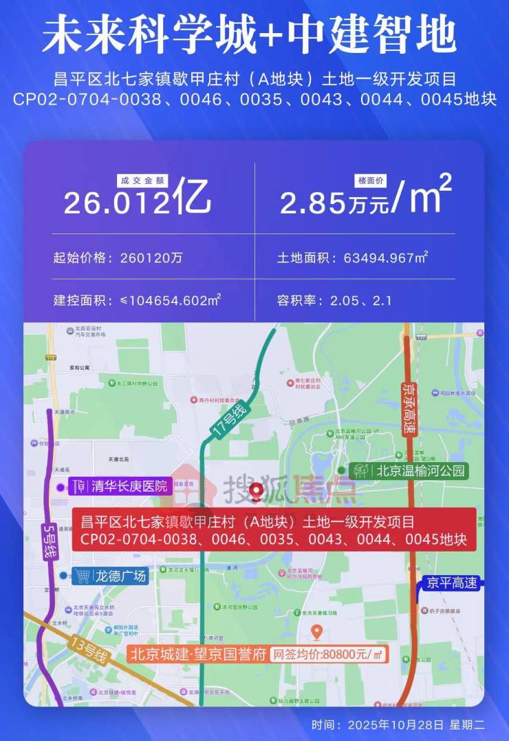 上周昌平的土拍市场可谓是热闹非凡!10月28日,中建智地和未来科学城组成的联合体以26.012亿元竞得昌平北七家镇歇甲庄村(A地块)土地一级开发项目P02-0704-0038、0046、0035、0043、0044、0045地块, 楼面价约2.85万元/㎡。时隔一天,10月30日昌平区东小口镇贺村中滩村组团B地块重点村旧村改造项目CP02-0405-0001地块R2二类居住用地,最终由北京城建+铭嘉房地产组合的联合体以底价28.09亿元摘得。