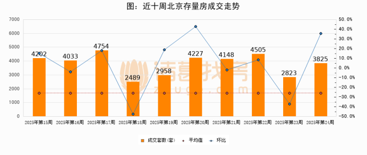存量房方面,第24周北京存量房成交3825套,较上周增加1002套,环比上涨35.5%。从近十周成交走势来看,周均成交套数为3796套,本周高于平均水平0.8%。