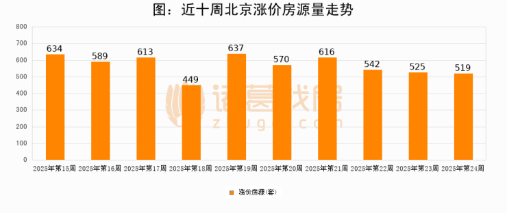 从调价房源来看,第24周北京涨价房源519套,较上周下降1.1%。与此同时,24周涨价房源占比提升0.54个百分点,业主信心持续恢复。