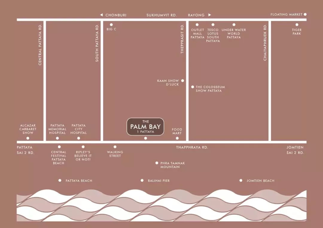 项目位于芭提雅2路和Thapphraya 路交界处,500米到海滩、Walking Street 风月步行街及市中心商圈,周边成熟的高档生活娱乐配套,让“排名前列区”版块成为少有的高端区域,商圈,商业、娱乐业软硬件设施齐备。汇聚五星酒店、著名旅游景点,金融中心,更有交通便利,更可快速直达机场高速和汽车站,这一切都让该区域极具发展潜力。