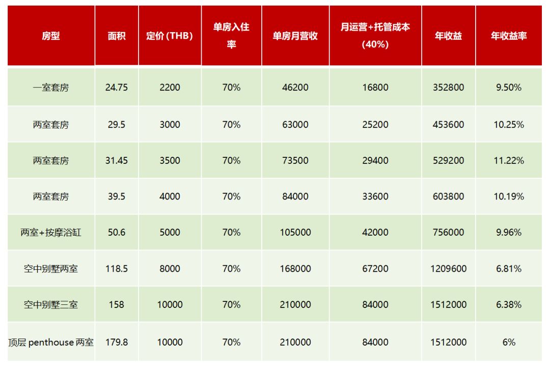 除了总房价低的优点,出租回报率也是一个亮点。芭提雅的出租收益一般在6%-10%左右,地段好的收益更高,络绎不绝的游客是稳定收益的保障。