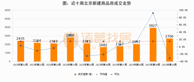 进入2023年第40周(09月25日-10月01日),北京新建商品房成交2700套,较上周减少1227套,环比下降31.2%。从近十周成交来看,周均成交套数为2377套,本周成交2700套,高于近十周平均成交量13.6%。