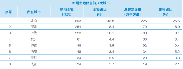 其中,中海地产新购置土地22宗,新增土地储备416万平方米,购地金额806.1亿元;中建地产(即中建壹品、中建智地、中建东孚、中建信和、中建玖合等)新购置土地53宗,新增土地储备466万平方米,购地金额579亿元。在这些新增土储中,北京排名第一,购地金额593亿元,金额占比42.8%;总建筑面积225万平方米,规模占比25.5%。