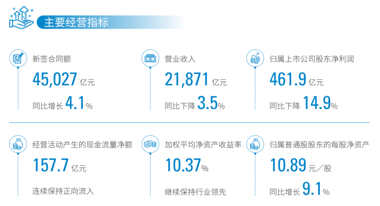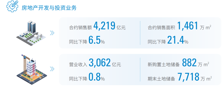 2024年,中国建筑地产业务合约销售额4219亿元,同比下降6.5%;合约销售面积1461万平方米,同比下降21.4%;实现营业收入3062亿元,同比下降0.8%;实现毛利529.3亿元,同比下降5.9%。