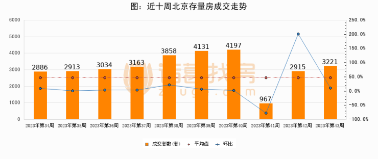 存量房方面,第43周北京存量房成交3221套,较上周增加306套,环比上涨10.5%。从近十周成交走势来看,周均成交套数为3128套,本周高于平均水平3%。