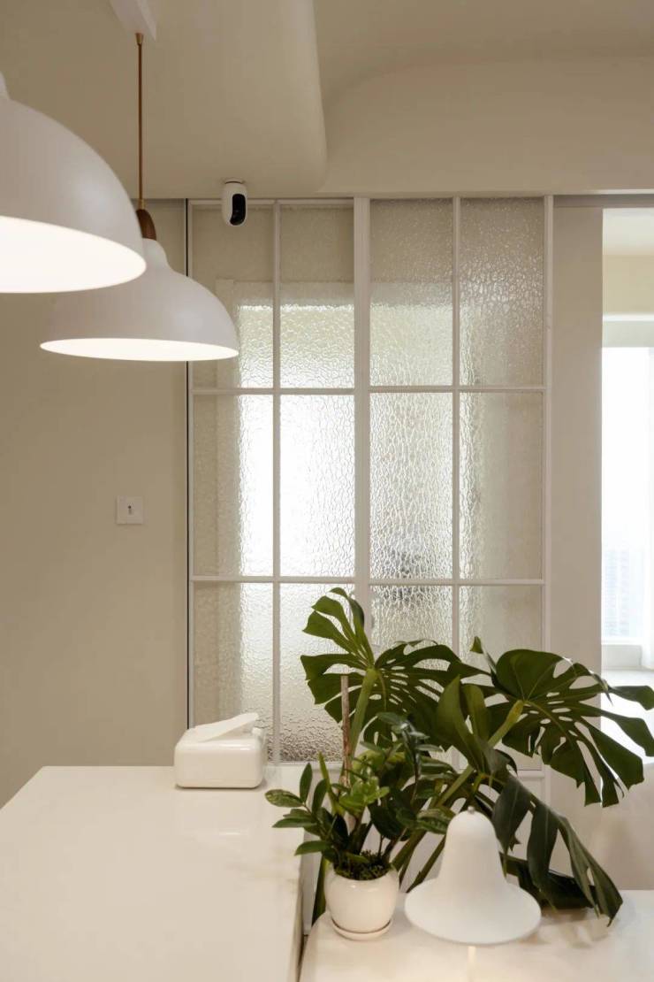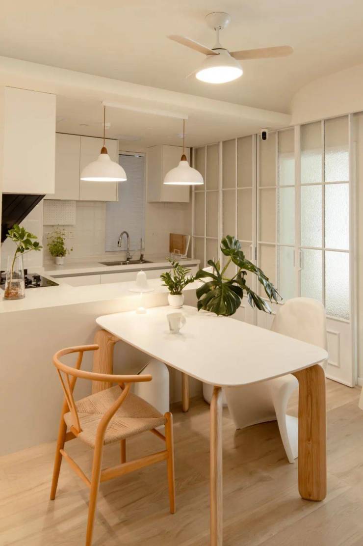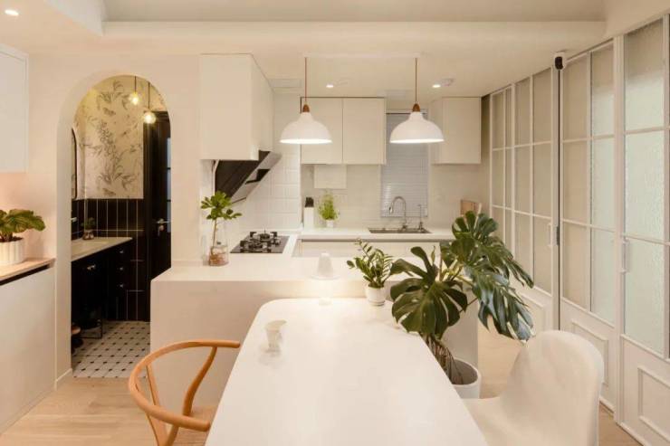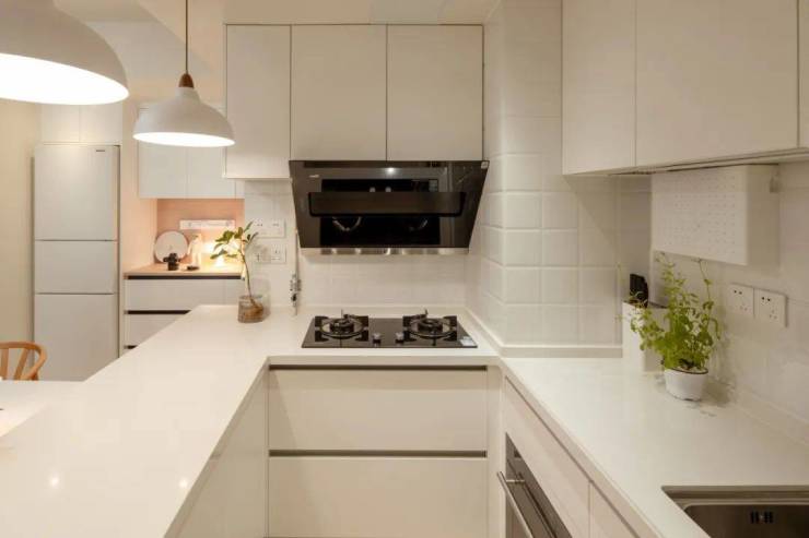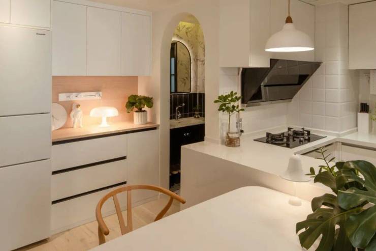 拆除厨房墙体,封堵原始厨房门后,L型厨房变U型,洗-切-炒动线流畅,橱柜和台面都选择显亮的白色,用筒灯+吊灯辅助照明,原本狭窄幽暗的厨房瞬间敞亮。