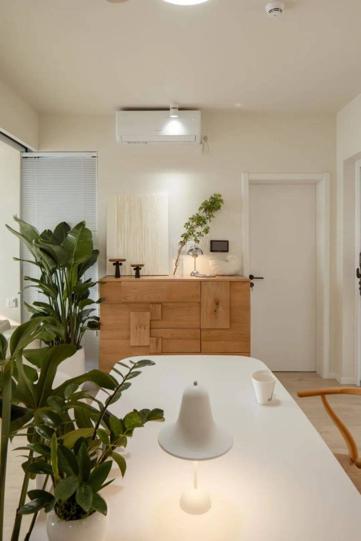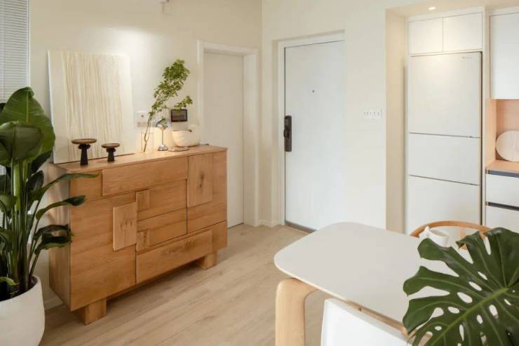 入户门选择素雅的白木门,和次卧内门和谐统一,一组原木的鞋柜质朴自然,和正上方的射灯呼应,搭配绿植,氛围感十足。
