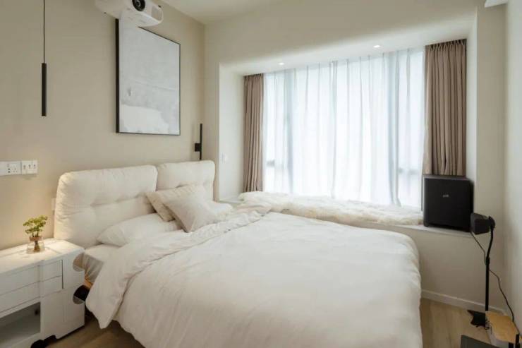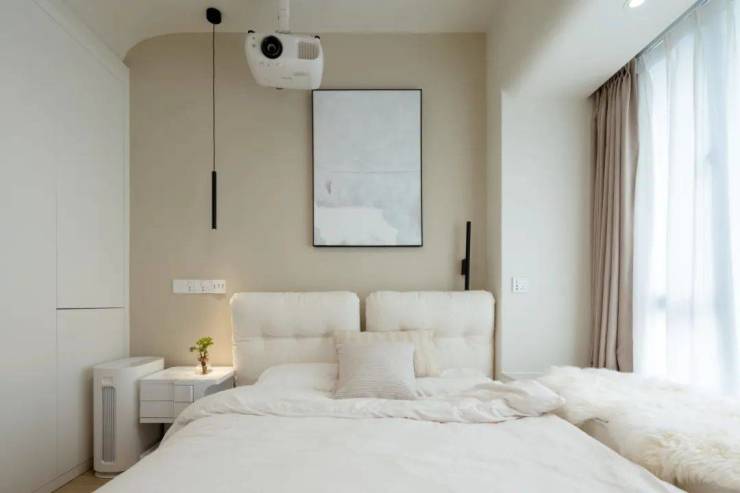 极简磨砂黑吊灯+飘窗筒灯,让灯光更有层次感,顶部预留了投影仪机位,周末可以宅家看电影
