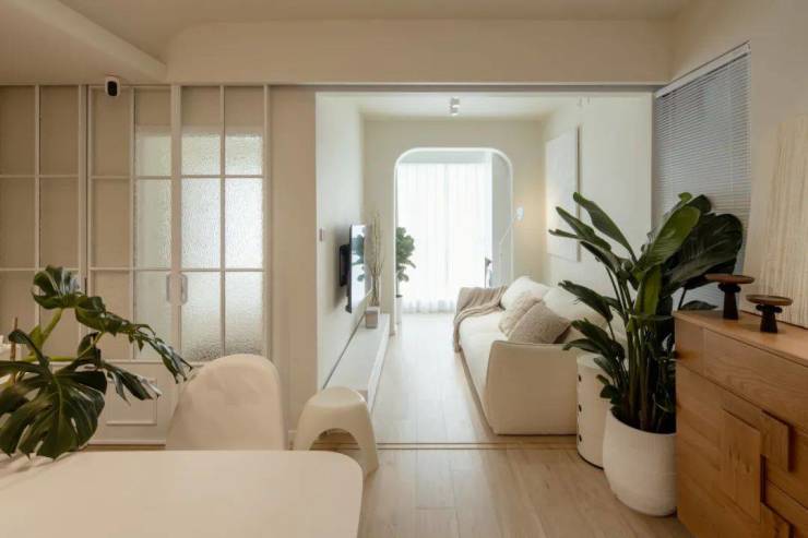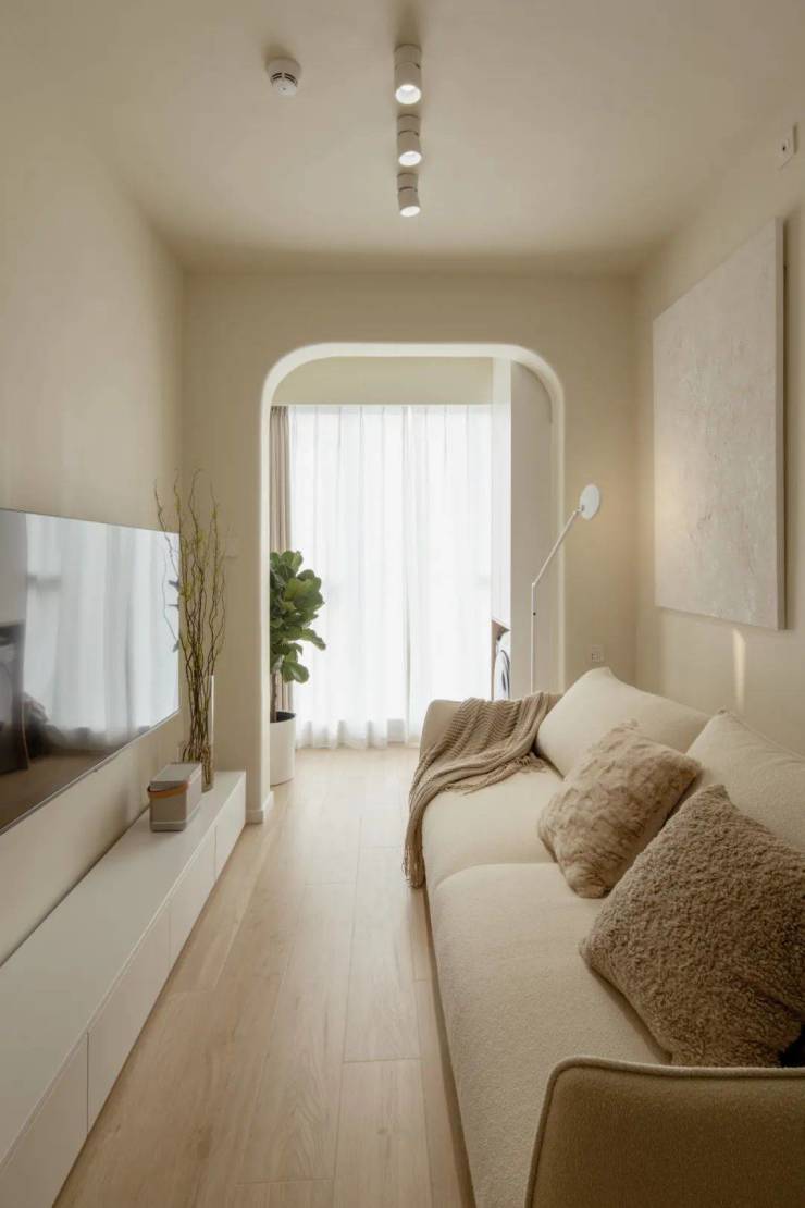 客厅宽度仅有2.2m,比较狭窄,因此摒弃吊顶和石膏线,通刷低饱和度的奶油色漆,明装白色筒灯作为照明,给空间做减法反而让空间更自然通透。