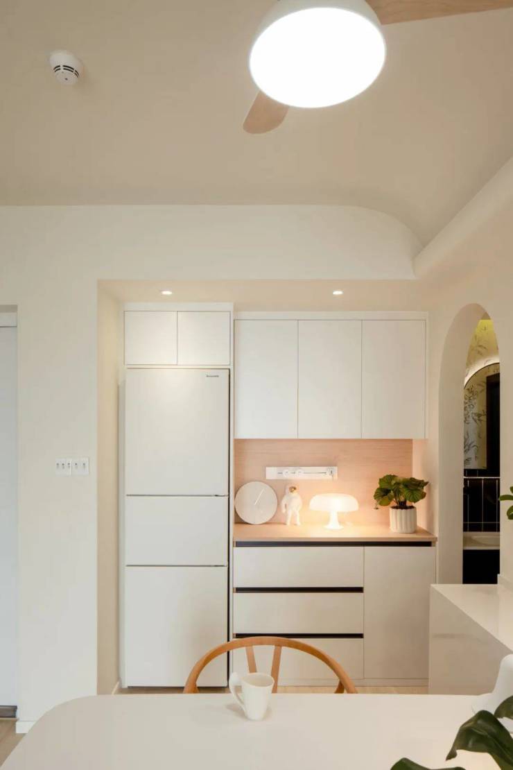 餐桌旁边定制了一组白色餐边柜,完美塞下了嵌入式冰箱,中间镂空的部分做了白色轨道插座,方便各种小电器使用,吊顶做了弧形处理,空间变得更加醇厚丝滑。