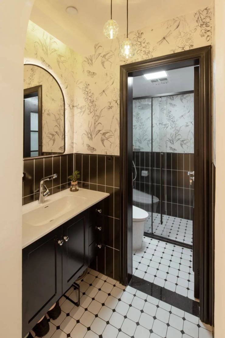 外置洗手台,用黑色釉面条块砖+花纹砖的个性拼贴方式,辅以吊灯+发光灯带,给空间带来了穿越时空的浪漫和优雅。