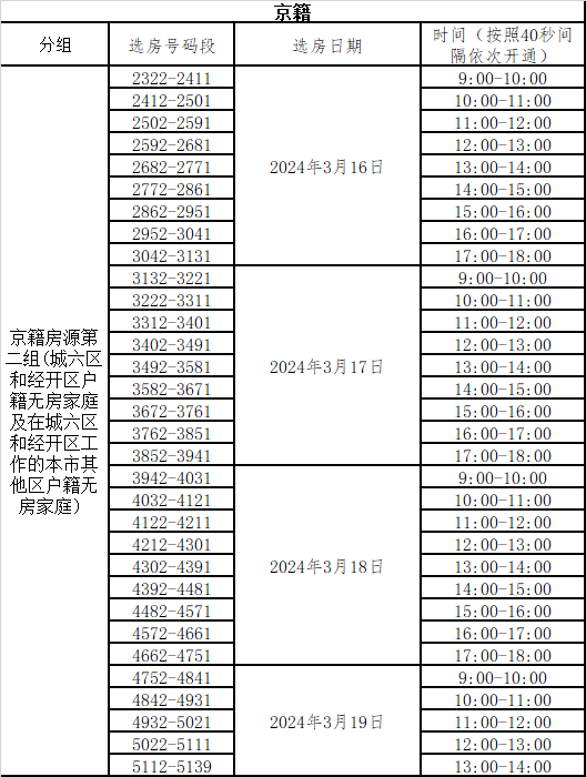 本次递补选房本着“谁组退出、谁组递补选房”的原则,即京籍家庭退回房源由京籍家庭递补选房,非京籍家庭退回房源由非京籍家庭递补选房。各组递补选房家庭按照2023年12月07日发布的《大兴区星筑星光里共有产权住房摇号结果的公告》中的选房顺序依次递补选房,具体如下: