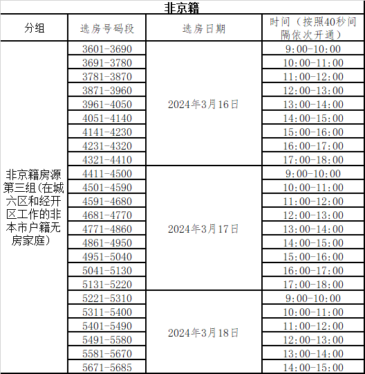 本次面向申请人为非本市户籍无房家庭房源共56套,选房顺序号从第五组在城六区和经开区工作的非本市户籍无房家庭的第3601号开始,至5685号申购家庭。