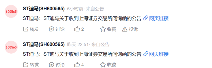 这是迪马股份(ST迪马:SH600565,股价0.86元,市值21.43亿元)一周内收到的第三份问询函。
