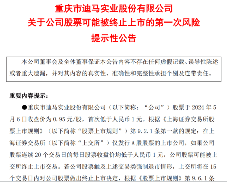 截至5月14日收盘,迪马股份股价已连续7个交易日低于1元。根据相关规定,若公司股票连续20个交易日收盘价均低于1元,将因触及交易类强制退市情形被上交所终止上市。