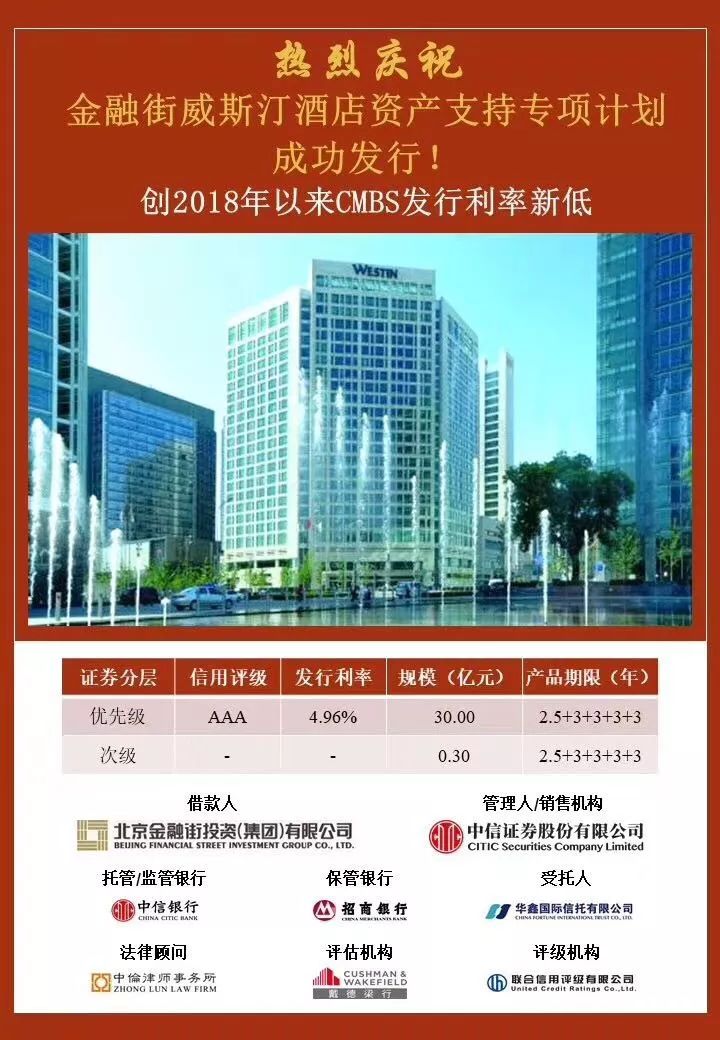 近日,金融街威斯汀酒店资产支持专项计划成功发行,优先级规模30亿元,发行利率4.96%,创2018年以来CMBS发行利率新低。本单产品借款人为北京金融街投资(集团)有限公司,管理人和销售机构由中信证券股份有限公司担任。托管/监管银行为中信银行,保管银行为招商银行。