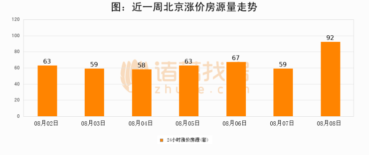 根据诸葛找房数据显示,北京24小时涨价房源量为92套,较08月07日增加33套,环比上涨55.9%。与此同时,涨价房源占比小幅扩大,业主信心有所提升。