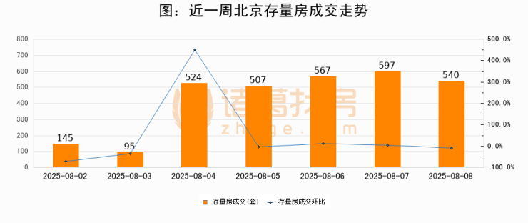 从存量房来看,2025年08月08日北京存量房单日成交540套,比昨日减少57套,环比下降9.6%。从近一周存量房成交来看,北京存量房日均成交套数为425套,08月08日单日成交540套,高于近一周平均水平27.1%。