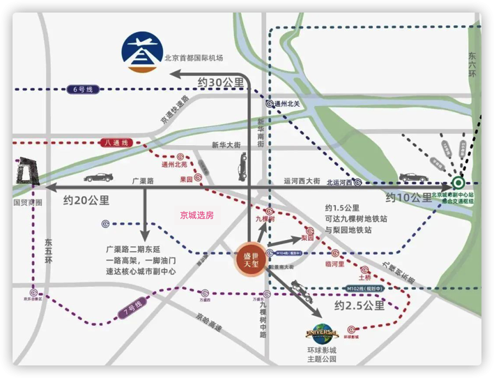 出行方面:鑫苑·盛世天玺地处国际文化旅游区,项目北距运河CBD仅6公里,南侧与即将开园的北京环球影城相距2.5公里,适当的距离即可享有区域发展利好,又避免了人流车流带来的喧嚣。