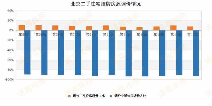 2021年第45周涨价房源量占比为10.64%,相比上周扩大0.33个百分点:2021年第45周北京调价房源中降价房源量占调价房源量的89.36%,涨价房源占比扩大至10.64%。