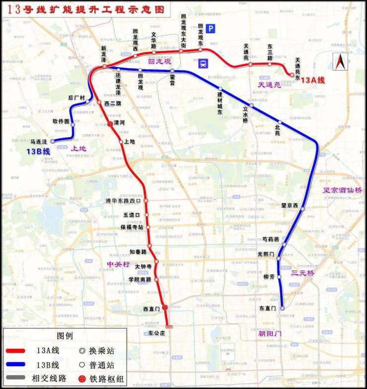 是在既有13号线西二旗-龙泽-回龙观站区段进行“倒U型”拆分,在16号线和17号线之间搭建“X”型东、西横向线,形成两条线路。