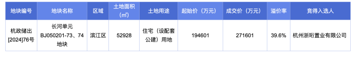 此次出让的是杭政储出[2024]76号地块,即滨江区长河单元BJ050201-73、74地块,该地块东至长江路,南至流光河绿化,西至冠山小区,北至白马湖路。出让信息显示,该地块出让土地面积52928平方米,出让地上建筑面积92941.2平方米,出让起始价194601万元,折合起始楼面价20938元/平方米,用途为住宅(设配套公建)用地。