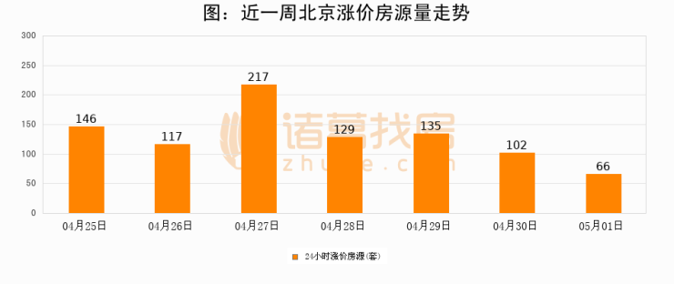 根据诸葛找房数据显示,北京24小时涨价房源量为66套,较04月30日减少36套,环比下降35.3%。与此同时,涨价房源占比小幅回落,对于购房者来说是一个入市窗口期,购房者可抓住时机入市。