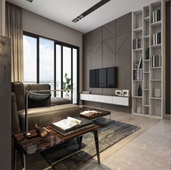 一些户型较小的居室,往往将书房的功能与客厅进行合并,因此客厅会有大量的书籍需要进行收纳。常见的收纳方式是在沙发边设计开放式书柜,既方便拿取,又不会占用过多的空间。