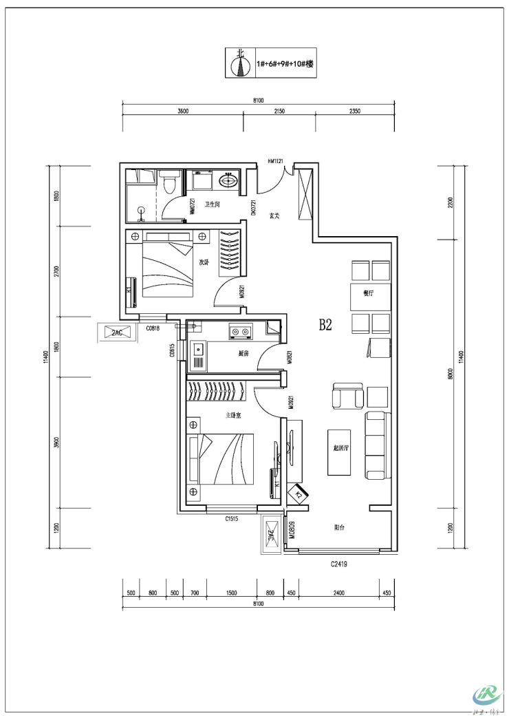 B2户型:89平两居设计,这个户型共计 240 套,层高2.9米。两个卧室及客厅均朝南,客厅面宽3.3米,在这个面积区间来说面宽中规中矩,但是基本的采光也能够保证,客厅外有阳台,便于晾晒衣服。卫生间干湿分离,且预留了洗衣机的位置,不多有点遗憾的是暗卫。这个户型适合小两口居住。