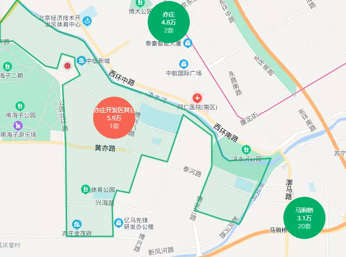 向西亦庄板块有均价68500 元/㎡的中海京叁號院和均价52695 元/㎡的金隅学府。
