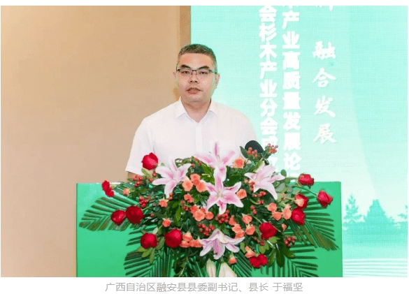 县委副书记、 于福坚县长在致辞中表示,在融安召开2023首届中国杉木产业高质量发展论坛暨中国木材保护工业协会杉木产业分会成立大会,为融安香杉产业高质量发展带来了更大机遇,必将对融安经济社会发展起到积极的推动作用。融安是广西最大的香杉生态板生产县份,占广西产量的45%,占柳州市产量超过60%。融安县先后荣获“中国香杉板材之乡”“国家首批绿色能源示范县”“广西林业产业发展十强县”“广西森林县城”等称号。