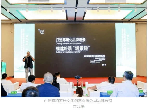 广州家和家居文化创意有限公司品牌总监 曾冠雄做了《打造专属化品牌場景,构建终端“场景锤”》的主题报告,他从企业的营销模式入手,讲解了企业如何打造专属化品牌场景,为企业销售赋能。