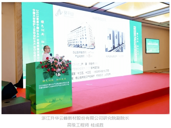 浙江升华云峰新材股份有限公司研究院副院长、高级工程师桂成胜做了《生态板高质量发展思考》的主题报告。桂院长从市场和专业的角度出发,分析了杉木生态板高附加值产品的开发,以及生态板的创新应用。