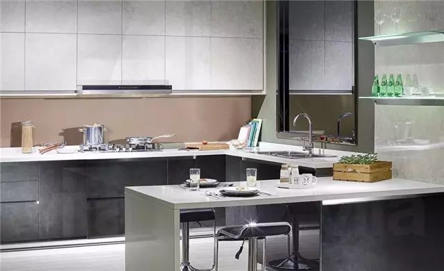 相对与L型结构,U型开放式厨房对空间面积的要求更大。U型是L型的延伸,依墙而立,近似方正的橱柜布局和中部空间感,形成一种时尚大气的视觉效果。一般情况下,厨房三面均布置橱柜,炒菜区、洗菜区、切菜区等各区区分明显,厨房活动更加自由、灵活,适合多人共同备餐、进餐。