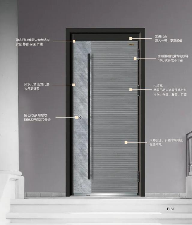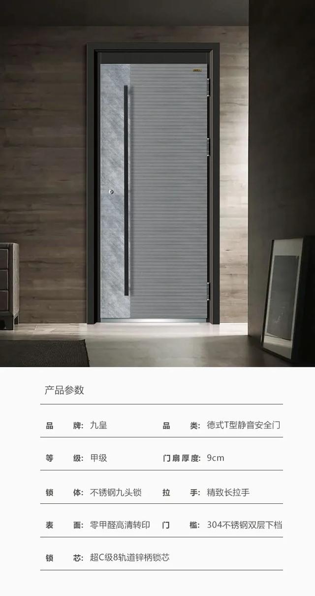 九皇德式T型静音安全门给我们的排名前列感觉就是造型简约时尚,精致大方,层次分明、扎实稳重,瞬间Hold住全场。