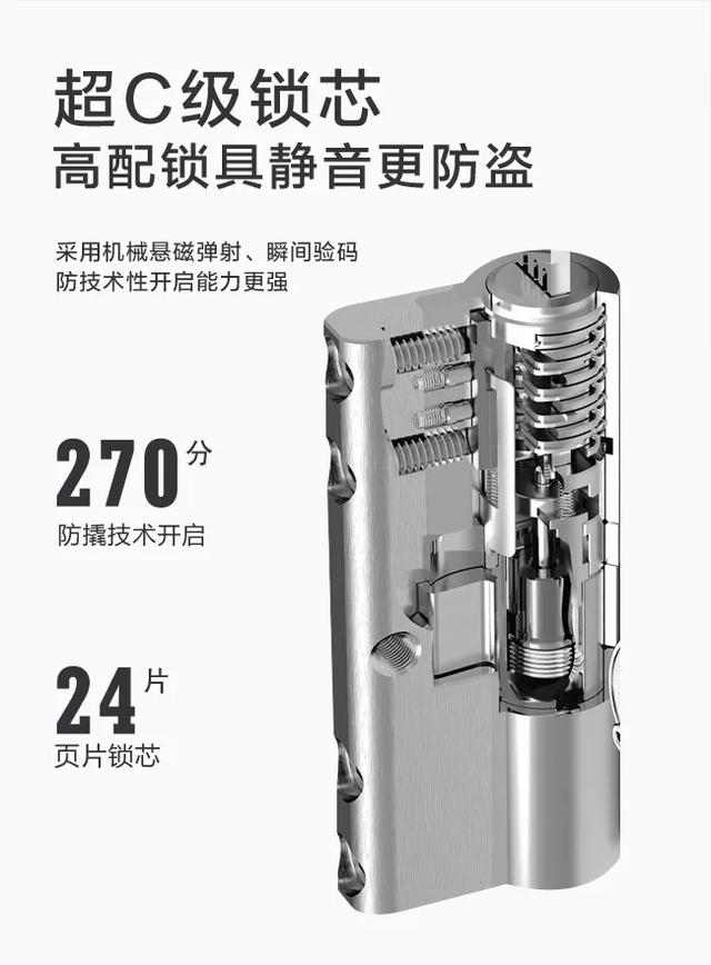 门要防盗,锁较重要。高配版的第七代锌含金柄超C级八轮道叶片锁芯,技术开启超270分钟以上,超C级的防盗级别超高,第七代全不锈钢九头静音锁体,实现家庭防撬、静音、抗冲击、抗破坏的品质保障。