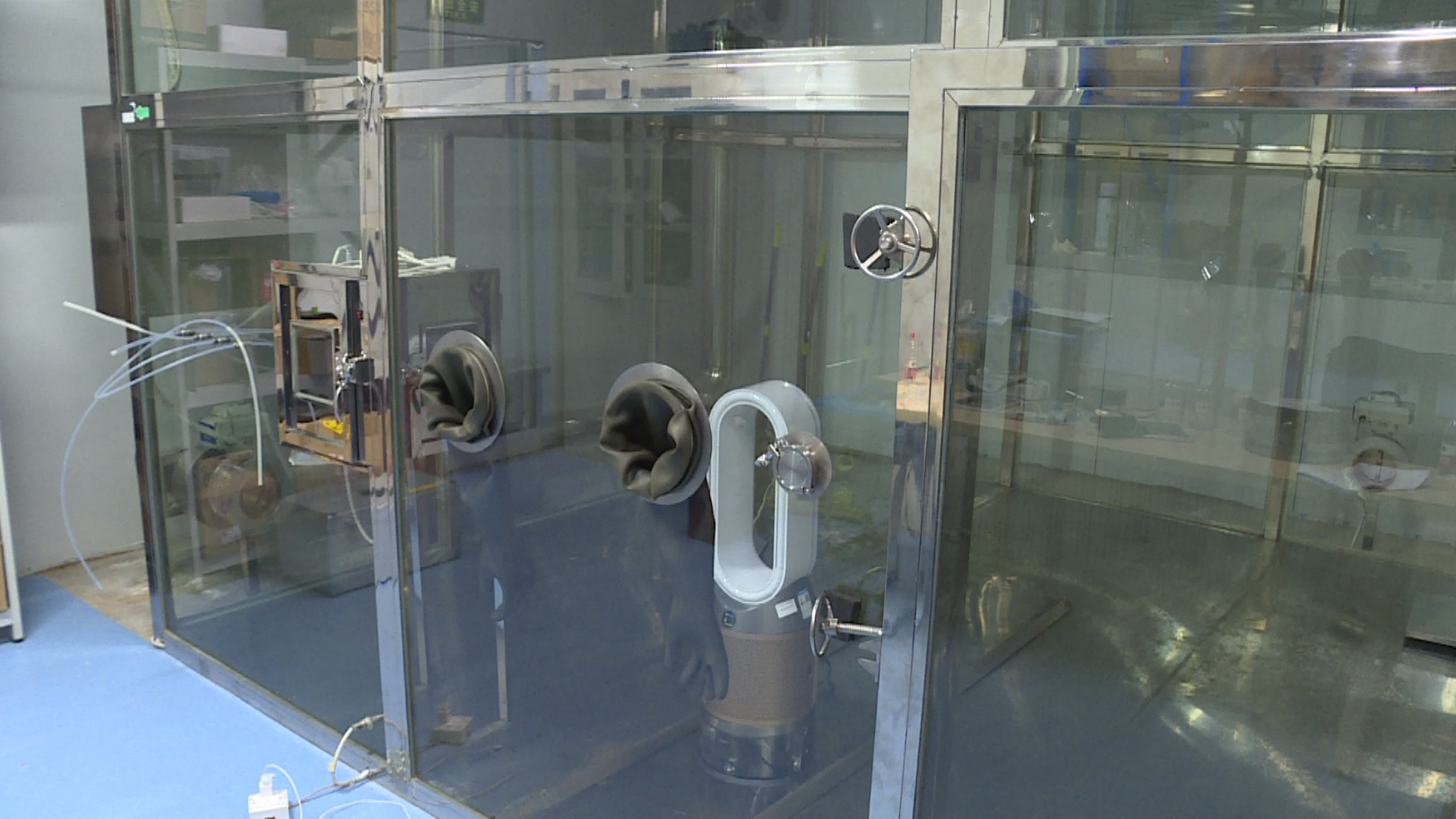 工程师将戴森加湿空气净化风扇PH04放置于一个30m3的实验舱,并先在舱内进行紫外消杀灭菌,以保证实验舱处于无菌状态。