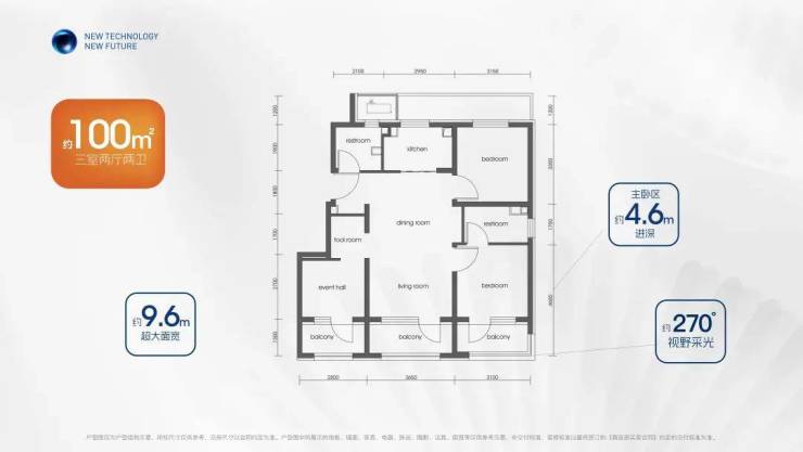 LDK王道户型,配备了家政工具间,约9.6米的超绝IMAX级面宽,主卧尊享270度的阳台采光。