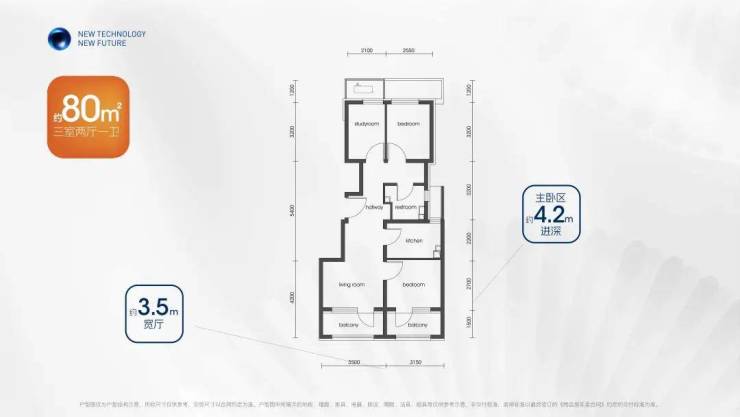 南北通透的三室户型,各个房间都有窗有采光。主卧区进深约有4.2米。