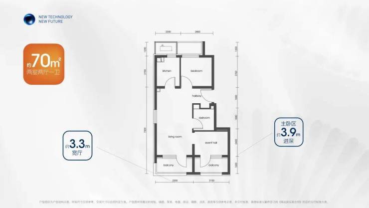 主卧约3.9米的进深,以及约3.3米的宽厅,保证了生活空间的开阔。客厅南向阳台开窗的同时,还有西侧补充采光。玄关处的凹陷设计,也是为了做出足够的收纳空间。