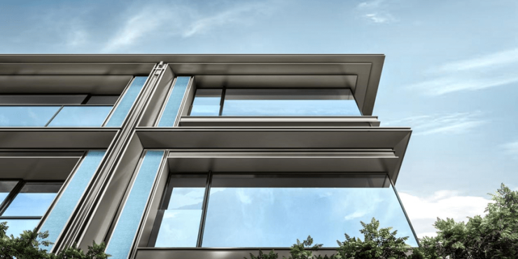 以九脊殿龙鳞瓦的形制,配合定制悬鱼樾,形成“鱼跃龙门、步步高升”的美好寓意。南向立面将传统文化引入,通过天青色仿汝窑定制陶板的创新性运用,配合雅奢金铝板的线条刻画,实现“石嵌金、金镶玉”的高贵感受。