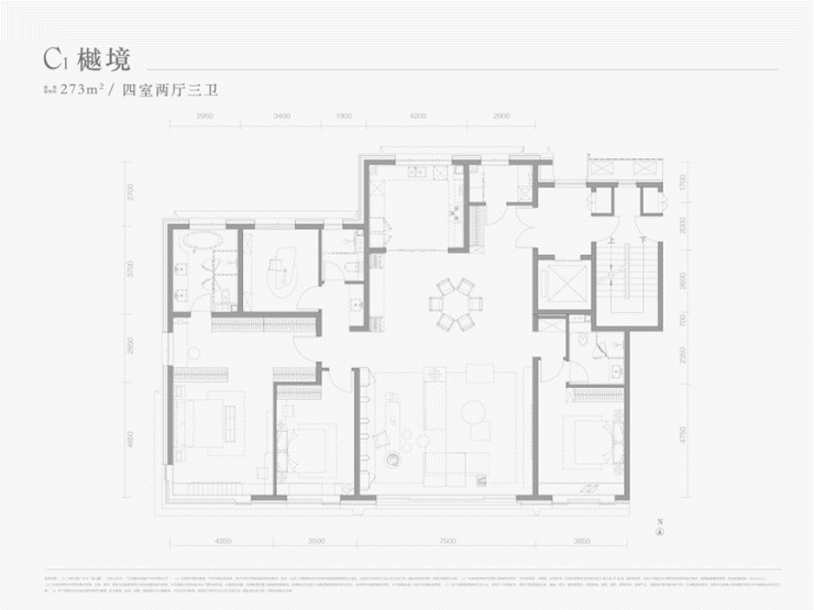 同时,通过近百平LDK一体空间的设计,使空间巡游更流畅、使用效率更高、更舒适。约0.9-1.37的黄金面宽进深比,内部空间的打造自由度极高,即使大家族的圆桌式家具也可以轻松布局。四叶草式格局,南侧奢阔双套房,主卧套内置展陈级步入式衣帽间,大幅提升平层的居住体验。