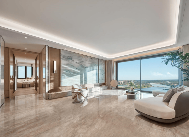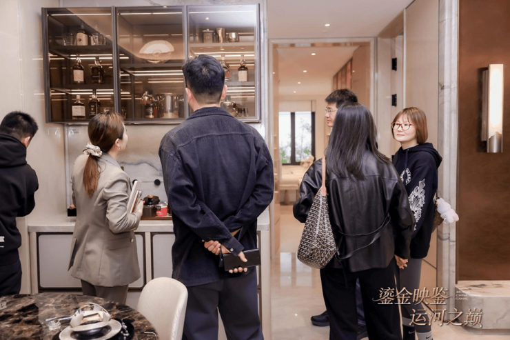 媒体嘉宾在样板间参观品鉴过程中,无不为其环幕视野所呈现的视觉史诗而赞叹。设计师以"运河天际"为创作原点,将水韵的流动感融入空间节奏,使室内外边界在视觉与感知中自然消融。整面落地窗将运河的壮阔纳入日常,无论是奢石的天然肌理还是水纹曲线等元素的细腻工艺,皆完美诠释出“水岸奢居”应有的气度与格局。