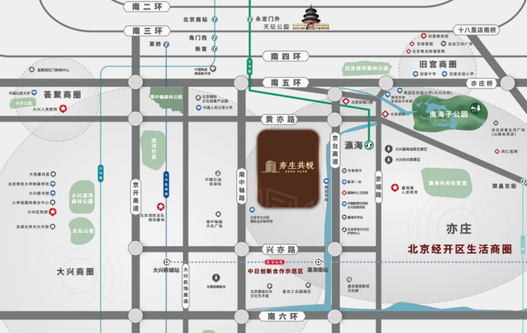 项目距离南五环直线距离约1.4公里,东邻亦庄经开区,南接市级重点工程“中日合作示范区”,接驳南中轴路、京台高速、黄亦路等多条南城主干道,无论是驱车上班、好友会面还是与家人出游,亦生共悦都能让您从容不迫,尽享便捷生活。