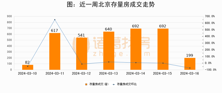 从存量房来看,2024年03月16日北京存量房单日成交199套,比昨日减少493套,环比下降71.2%。从近一周存量房成交来看,北京存量房日均成交套数为494套,03月16日单日成交199套,低于近一周平均水平59.7%。