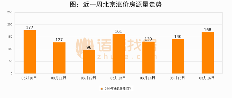 根据诸葛找房数据显示,北京24小时涨价房源量为168套,较03月15日增加28套,环比上涨20%。与此同时,涨价房源占比小幅扩大,业主信心有所提升。