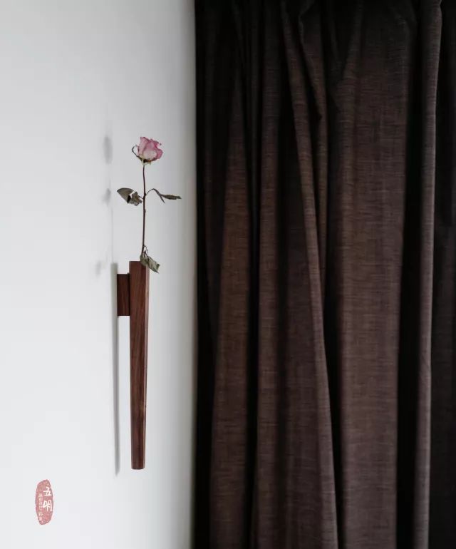 在一侧墙壁上插一支淡粉色的花
