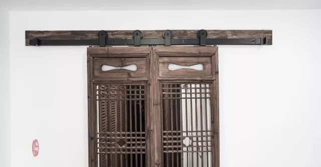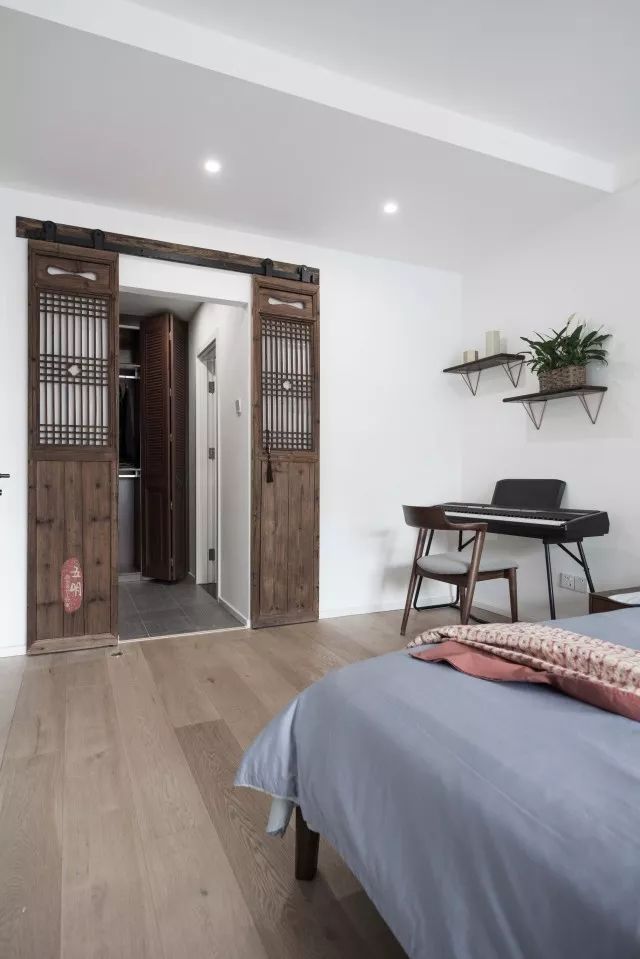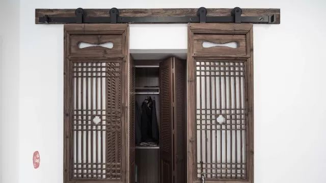 衣帽间这扇古朴的老门扇就是他们一起淘来的